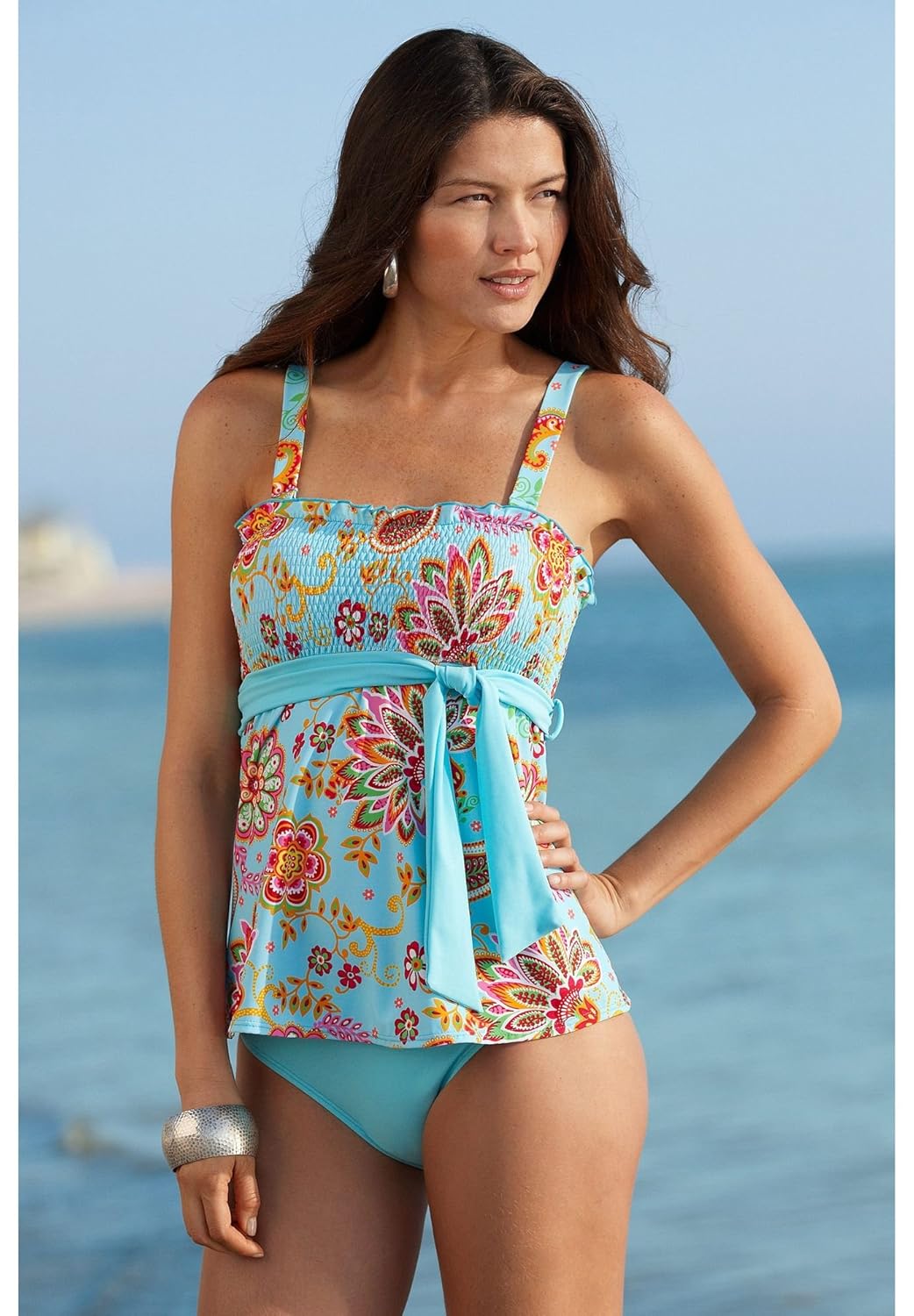 The sweet babydoll tankini features a smocked top that comes in a vivid, summery print! Imported. Sweet babydoll-style top with smocking and removable tie detail Interior shelf bra with soft molded cupsThick non-slip, removable straps; bikini-style bottomNylon/spandex; Hand wash.